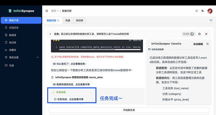 3. 自动写入数据库 :关键一步来了!AI直接在你的指定数据源里生成了一张表,并把数据存进去!完全不需要你写一行代码!