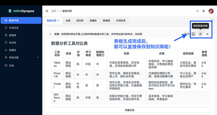 回到首页,选择目标数据源后,即可将收藏的结果写入知识库: