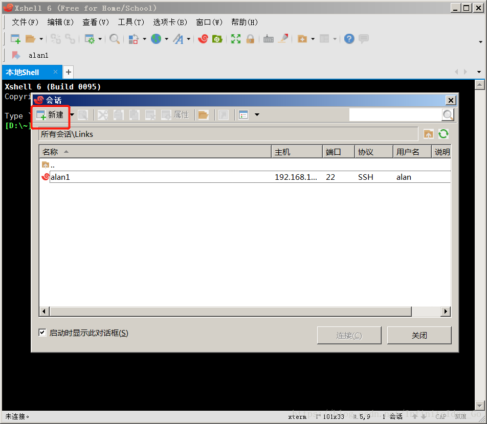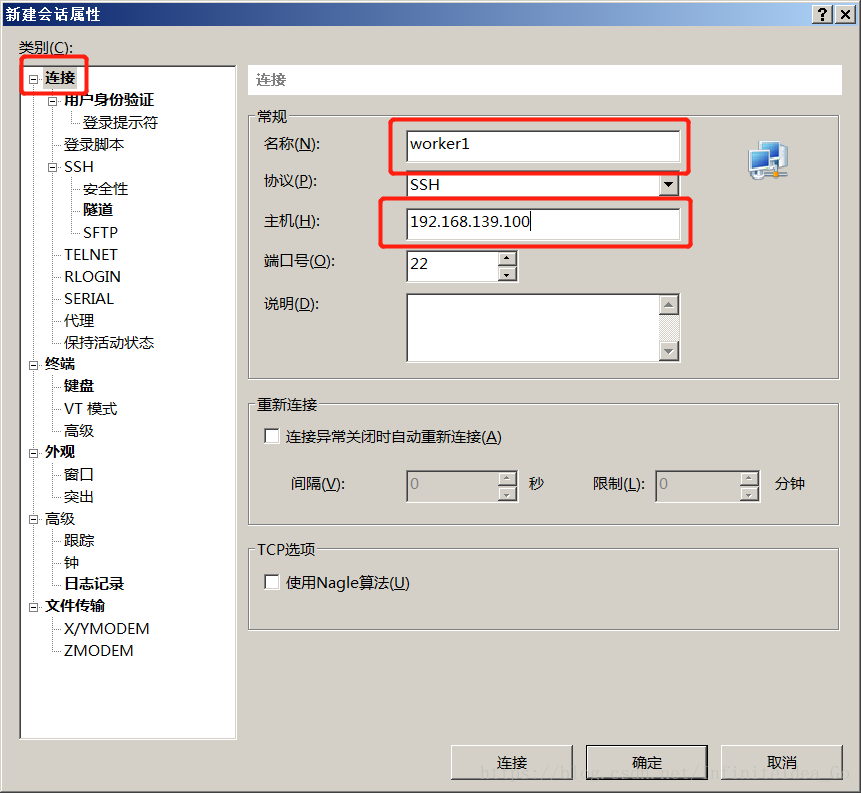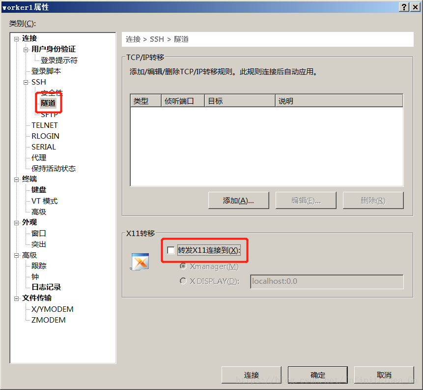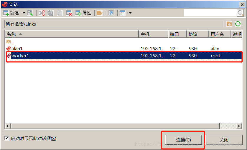 d)设置完成之后,就会回到会话界面,worker1就是刚才配置的,然后点击连接就可以进行远程登录服务器