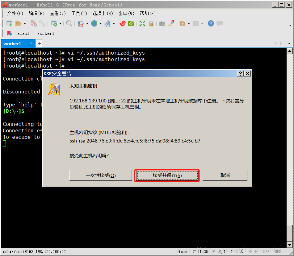 第一次密钥登录时候,会出现安全警告,点击接受并保存即可
