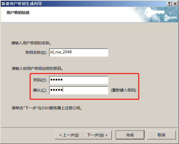 3)设置密钥的密码,密钥登录时候需要使用到,一定要记住