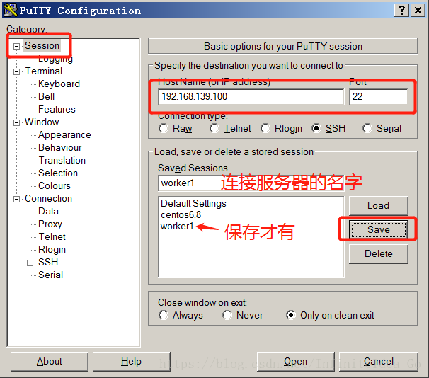 长的红色框里输入要远程登录的服务器ip,后边是登录的端口号,如果端口号没修改的话就是默认22;然后给连接的服务器命名,并保存,这样下次登录可以直接选择对应的名称登录,选择完之后,点击open即可连接服务器