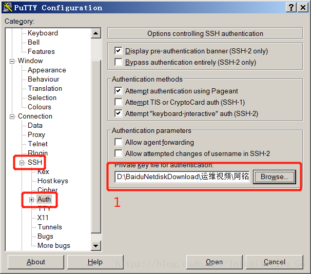 然后找到ssh选项添加私钥,1)Browse按键,添加刚才保存的私钥,接着就可以点击open就可以使用密钥登陆服务器了