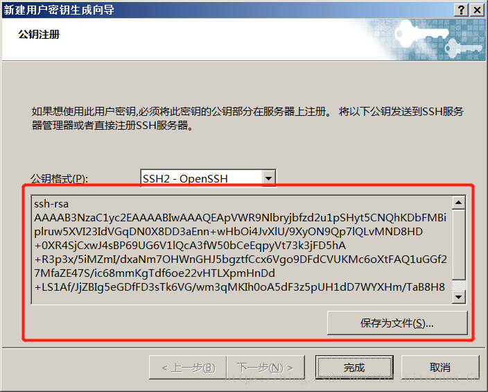 4.5跳转到公钥生成了,然后点击保存为文件把公钥保存下来,这时候把公钥拷贝到远程服务器端上的配置文件~/.ssh/authorized_keys (如果没有这个文件需要执行下步骤,已有该文件可以跳过)
