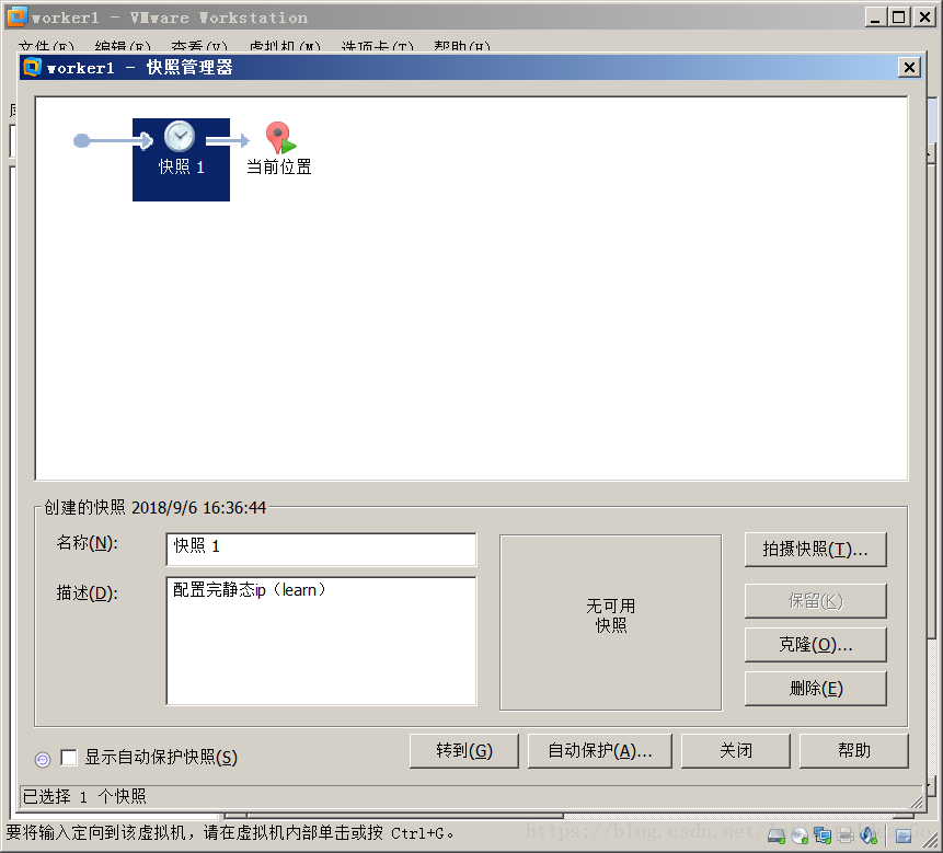 需要的时候,可以回到当时保存的快照,步骤:VMware workstation的菜单,虚拟机->快照->快照管理器,选择快照,转到快照启动