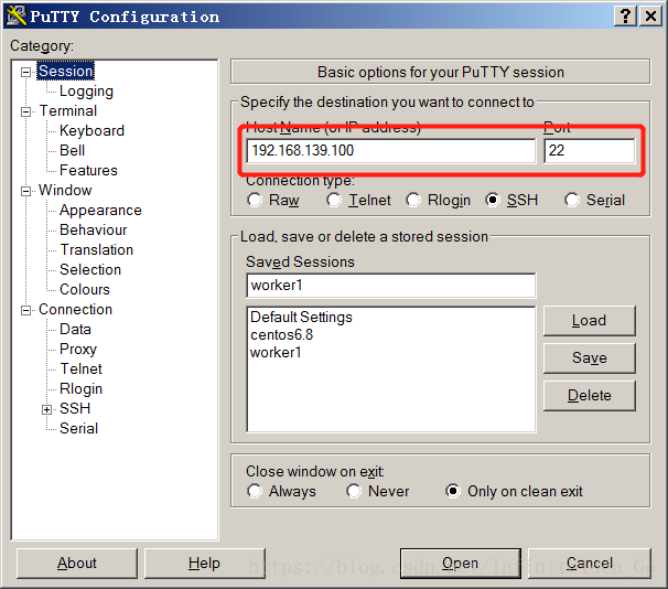3.1.3生成完密钥之后,启动putty.exe软件,Load用户worker1,确认ip和端口号是否正确