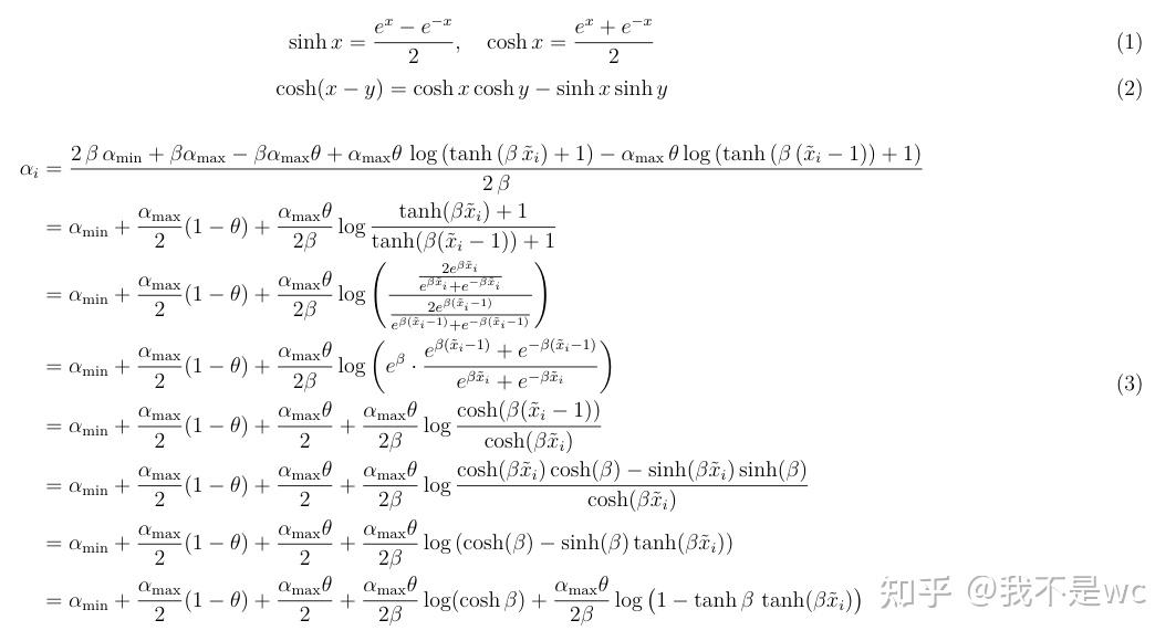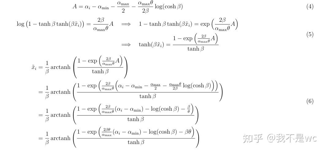 x ~ i = 1 β arctanh ( 1 − exp ( 2 β θ α max ( α i − α min ) − log ( cosh β ) − β θ ) tanh β ) \tilde{x}_i= \frac{1}{\beta} \operatorname{arctanh} \Bigg( \frac{1 - \exp\Big(\frac{2\beta\theta}{\alpha_{\max}}(\alpha_i - \alpha_{\min}) - \log(\cosh\beta) - \beta\theta\Big)}{\tanh\beta} \Bigg) x~i=β1arctanh(tanhβ1−exp(αmax2βθ(αi−αmin)−log(coshβ)−βθ))