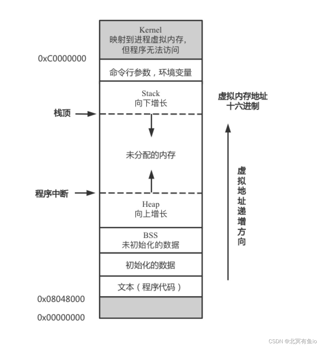 存放函数形参和局部变量,函数结束返回时自动释放空间。先进后出,向地址减小方向增长(由高地址到低地址)。