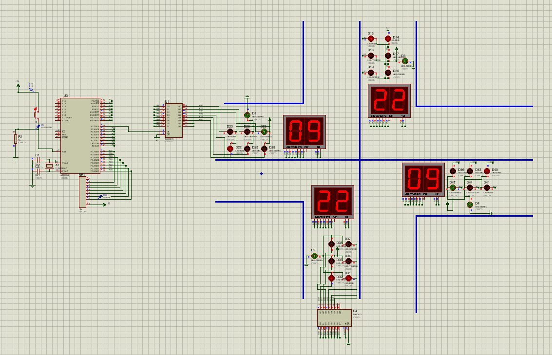 写了个测试小程序一跑,懵逼了。。出现了Simulation is not running in real time due to excessive CPU load 这条警告。当时百度了很久都没有查询到问题,所以就放弃这个电路了。(现在知道解决办法了,在我的另一篇博文中有介绍)当时没办法,只好又画了个简单点的电路,同时把这些乱七八糟的线全部变成net标号了。最终如下图所示,这个电路是不改LED属性也能跑的,当然现在我已经全改了,因为我们只需要LED有亮灭两种状态就可以了。