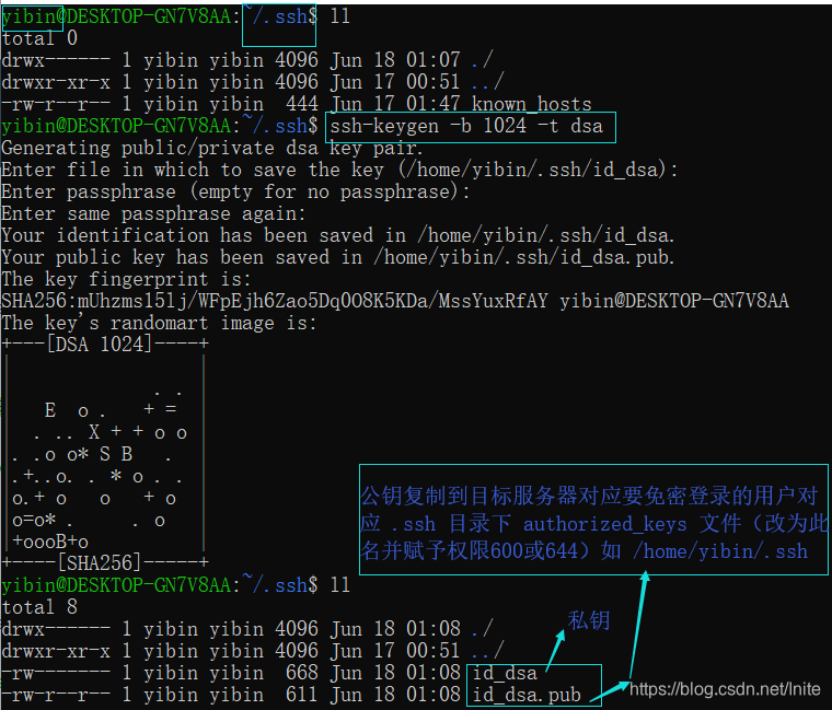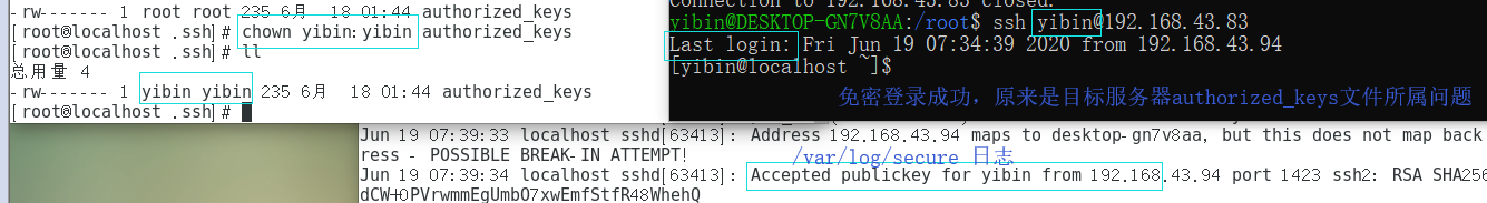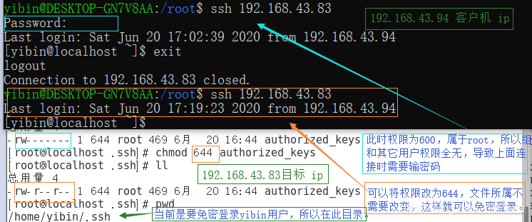 比如客户机 yibin 用户需要免密登录到服务器 yibin 用户,首先在 yibin 用户下生成密钥对,再将公钥复制到服务器 yibin 用户家目录 .ssh 目录下,确保生成文件:~/.ssh/authorized_keys(即 /home/yibin/.ssh/authorized_keys),保证目录 .ssh 权限为 700,authorized_keys 文件权限为 644,一开始我设置成权限为 600,结果就踩坑了,一直没缓过神来,无意间发现文件所属还是 root,然后设置权限是 600 的话,意思是只有 root 有读写权限,组和其它用户都无权限,导致无法免密登录。