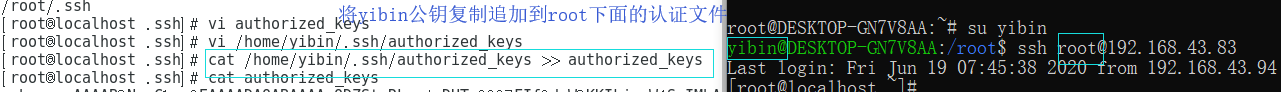 2、接下来我就想在客户机用 root 用户免密登录目标服务器的非 root 用户,比如 yibin 用户,聪明的你肯定想到了,没错就是将客户机 root 用户的公钥放置到目标服务器的 yibin 用户家目录下 .ssh 目录下,改名为 authorized_keys,完整路径为 /home/yibin/.ssh/authorized_keys,注意 .ssh 文件夹权限需设置为 700,aurhoriized_keys 文件权限为 600 或 644。