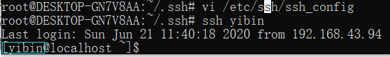 最后假如需要使用别名连接远程服务器,可以在客户端的 ssh_config(/etc/ssh/ssh_config)进行配置。vim /etc/ssh/ssh_config #新增如下内容 Host yibin HostName 192.168.43.83 Port 22 USER yibin IdentityFile ~/.ssh/id_rsa #这个默认的,不加也行 #保存退出就可以使用下面命令连接了 ssh yibin