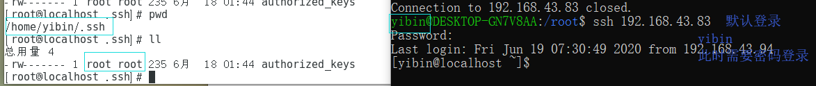 同样的原理,此时需要在客户机非 root 用户下,我这边是 yibin 用户,从 root 用户切换到 yibin 用户命令,su yibin ,接下来就是生成密钥对了,可以直接使用命令 ssh-keygen 按回车默认生成 rsa 密钥对,再将公钥 id_rsa.pub 上传到服务器的 root 用户家目录的 .ssh 目录下,生成文件:~/.ssh/authorized_keys(即 /root/.ssh/authorized_keys),检查 .ssh 文件夹权限是否为 700,authorized_keys 文件权限是否为 644,注意这里是设置为 644 而不是 600了,否则一直提示需要密码登录。失败原因和下面第4点情况一致,所以统一在第4点解释。