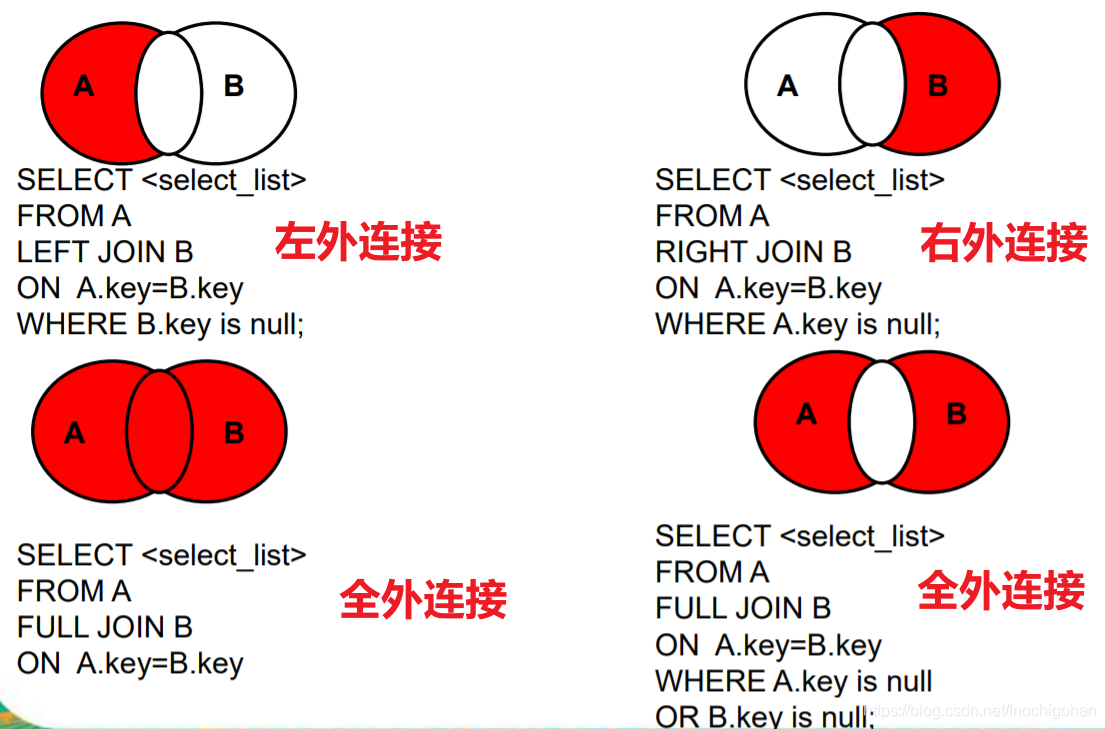 ⑥外连接一般用于查询除了交集部分的剩余的不匹配的行
