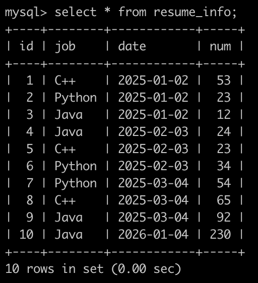 最后1行表示,在2026年1月4号,Java岗位收到了230封简历