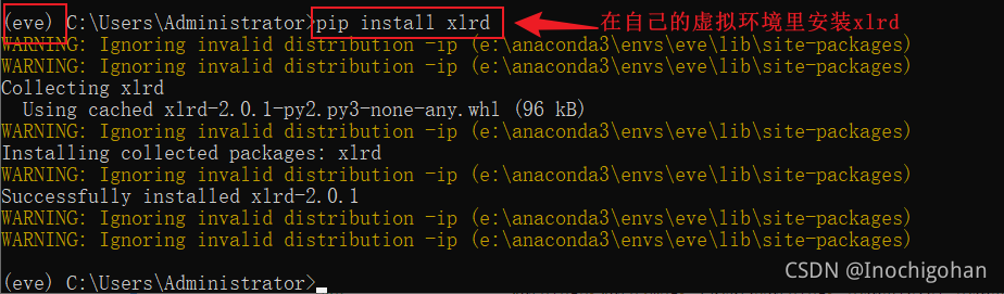 打开Anaconda Prompt,进入对应的虚拟环境,使用命令行pip install xlrd安装相应的安装包