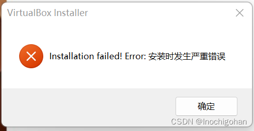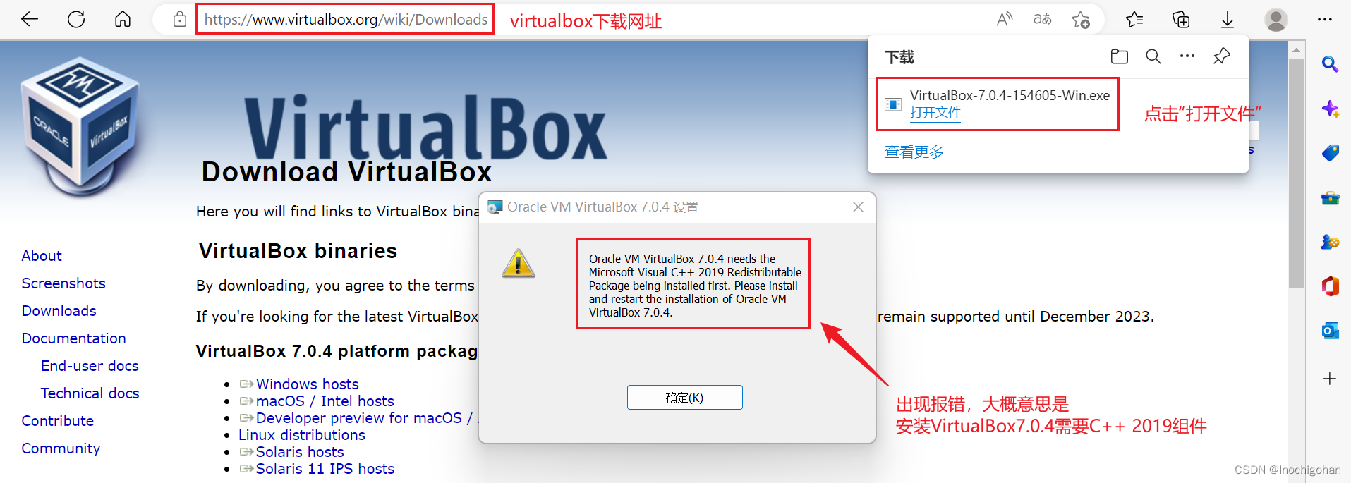 大致意思为:安装VIrtualBox 7.0.4 需要C++ 2019组件。点击确定后会出现弹窗告诉你,安装流程中断,程序安装失败。