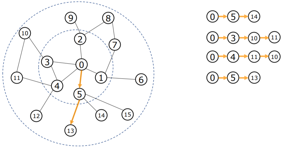 从节点0开始游走四次,第一次游走经过的节点为0——>5——>14,第二次游走经过的节点是0——>3——>10——>11,......,可以看到其中5、10、11、三个节点出现的频率最高,将这三个节点与0号节点相连作为0号节点的虚拟邻居: