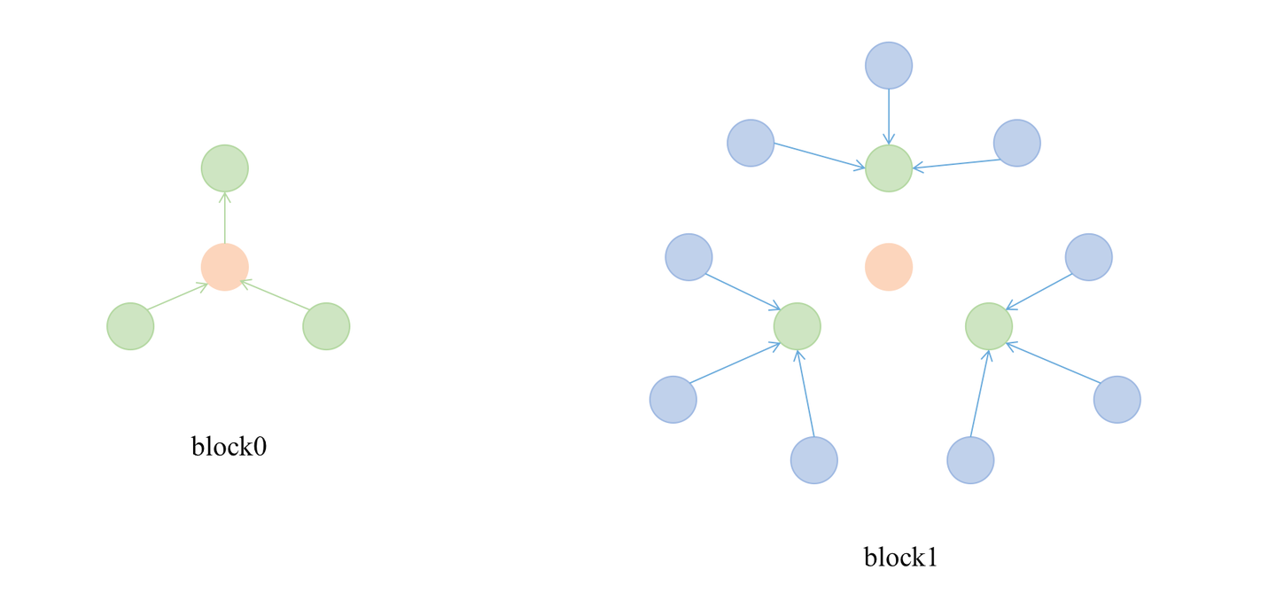 两次采样完成后,会将这两个block存入到blocks这个数组中,但block1会插入到block0前面,这是因为我们的卷积层数是两层,第一次卷积时是将block1中蓝色的节点信息聚合到绿色的节点上,第二次卷积时是将绿色的节点信息聚合到橙色的节点上。橙色节点是两层卷积后的最终输出节点。