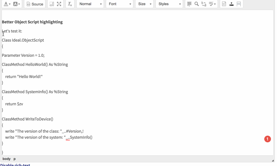 为此,请将代码放入编辑器,将其选中,然后点击 ObjectScript 按钮。