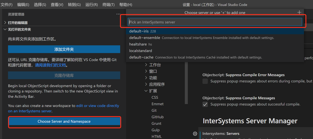 进入VSCode 设置中找到“扩展”下的Intersystems Server Manager ,进入设置可见安装自带的服务器连接字符串可以依据用户需要进行添加和修改