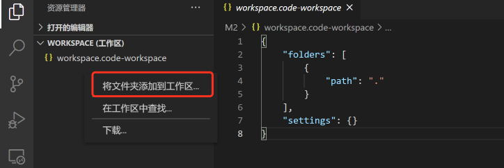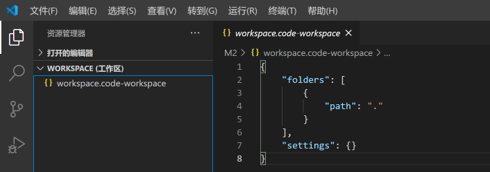 首先将一个文件夹添加到工作区,并保存工作区,在保存之后的工作区中可以看到如下的工作区配置文件(