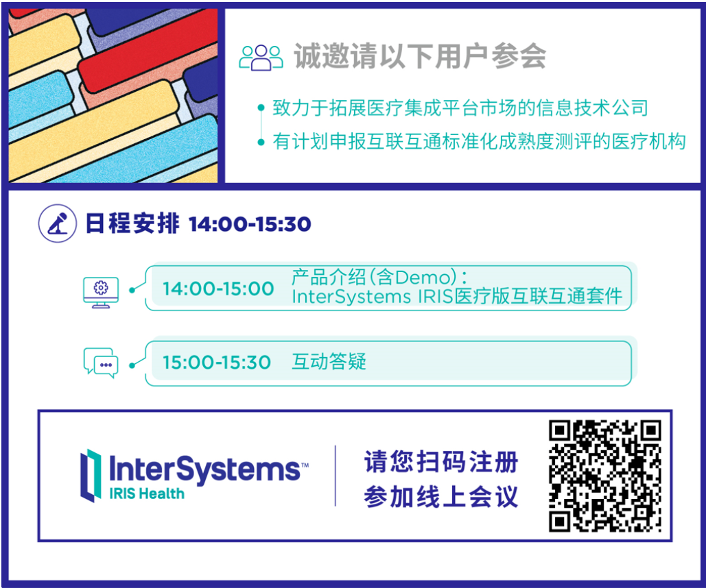 InterSystems将于2021年9月17日举办“InterSystems IRIS医疗版互联互通套件”线上发布会,会议详情如下,欢迎点击“此处”或扫描下方二维码报名。