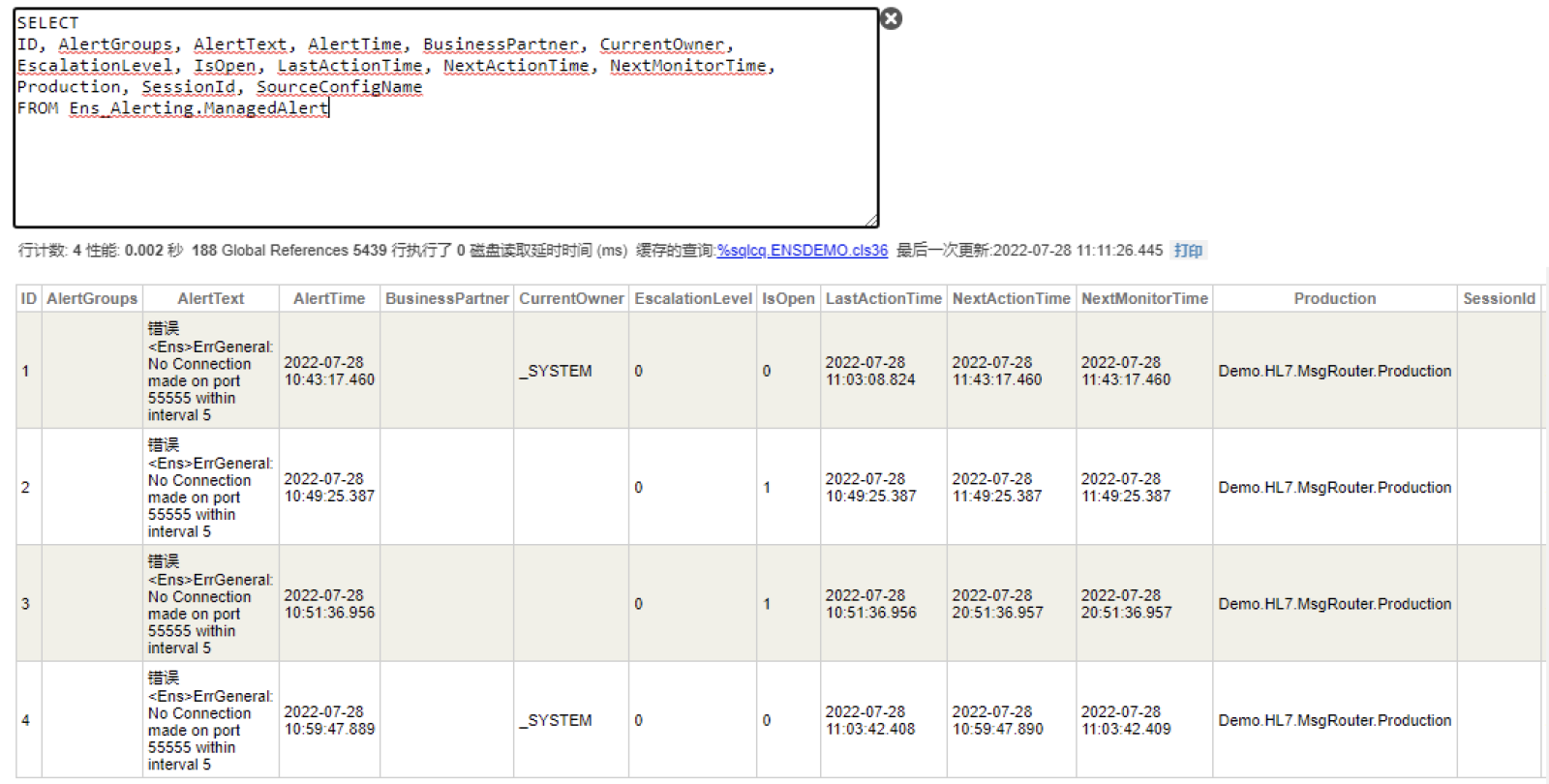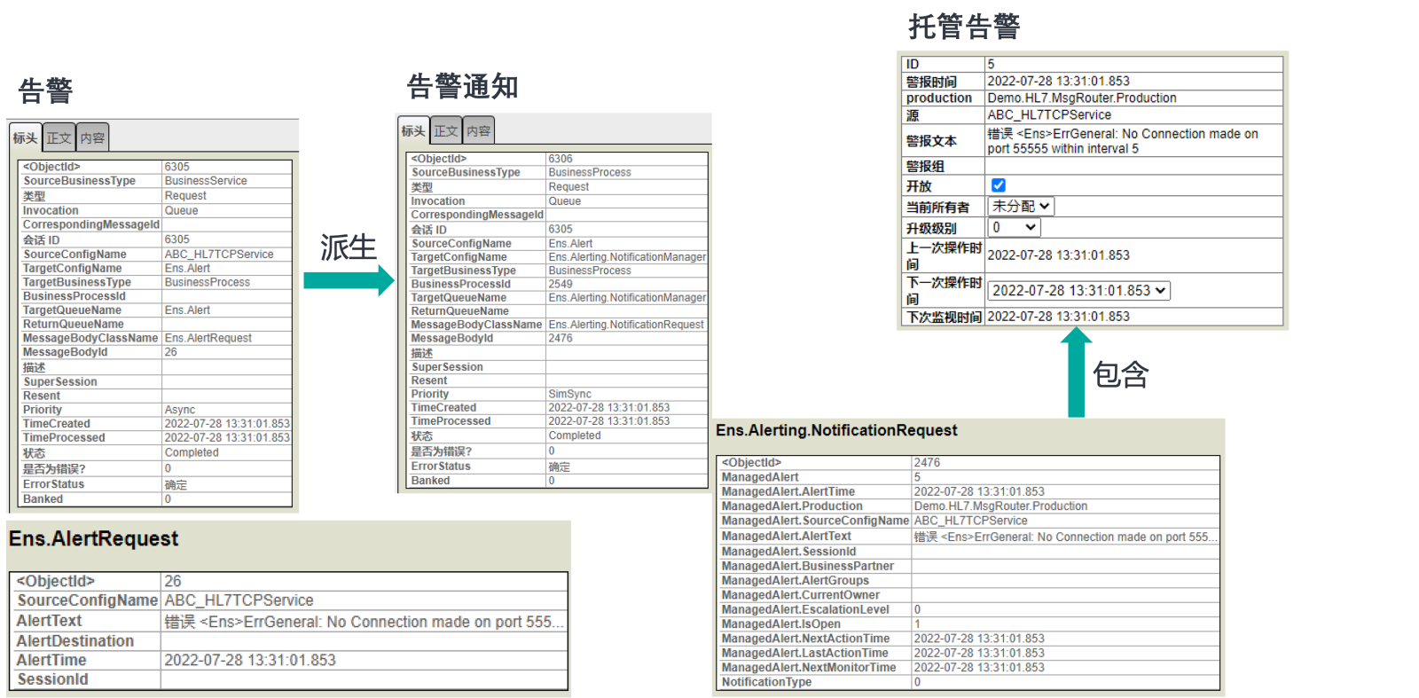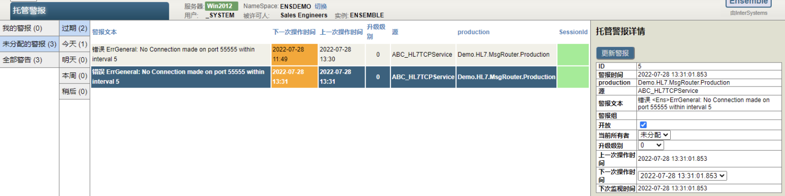 在互操作功能运行过程中,IRIS可以识别异常情况的发生,自动生成告警事件并通过预制的互操作组件将告警转发给干系人;另外,IRIS也内建了告警工作台,可供运维团队基于工作流实现对告警的管理。