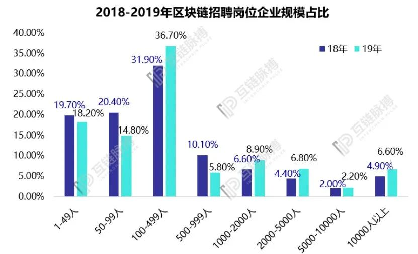 根据互链脉搏与猎聘联合制作的《2020年中国区块链人才发展报告》报告显示,2019年参与招聘区块链岗位的企业中,规模在499人以下企业占比高达七成,其中企业规模在100—499人区间的中型企招聘业数最多,占比达36.7%。