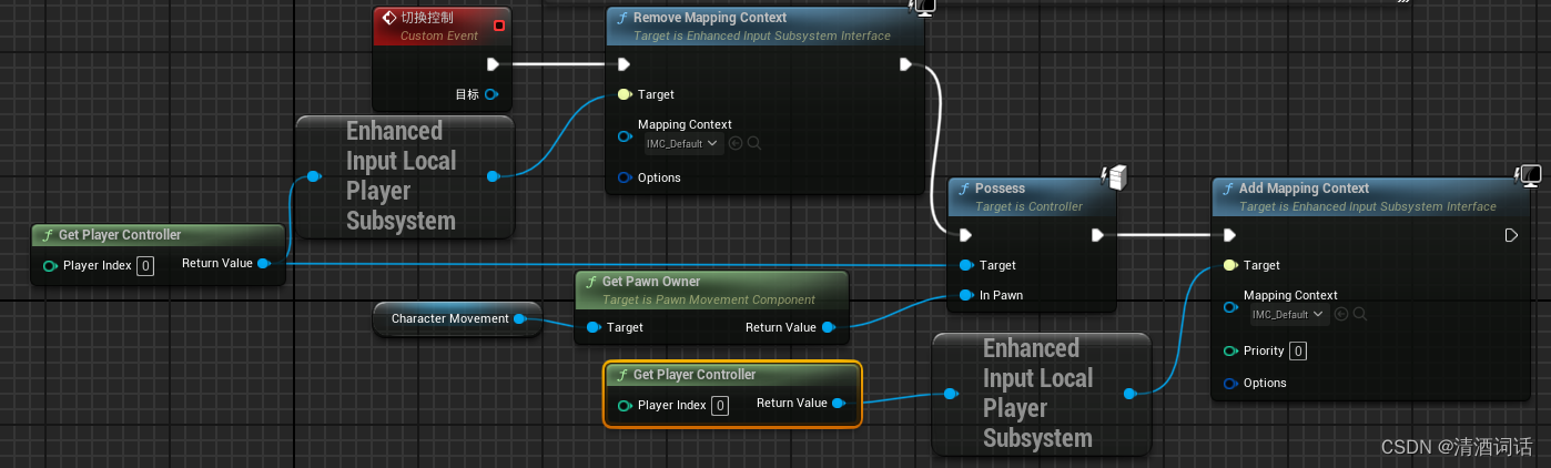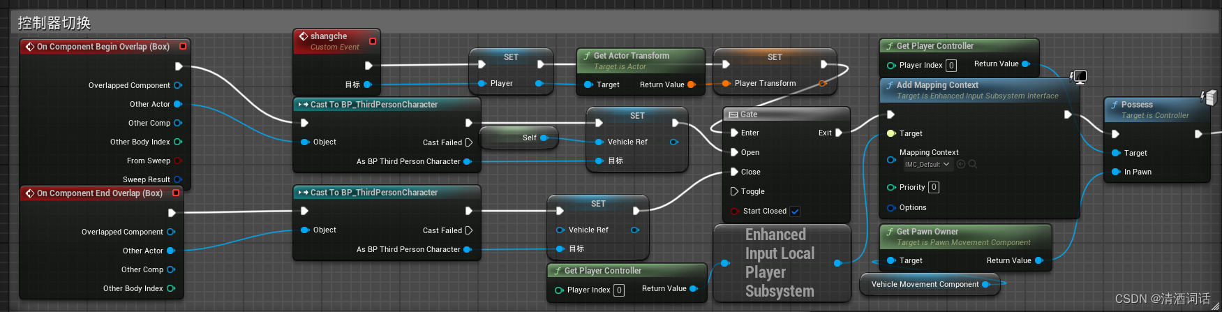 上图是人物靠近汽车模型后,按键触发,其主要就是获取当前玩家控制器,从当前控制器获取输入子系统,然后进行映射
