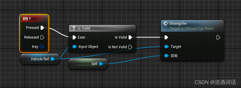 这是人物蓝图 ,按下F键触发汽车蓝图中的自定义事件(Shangche)