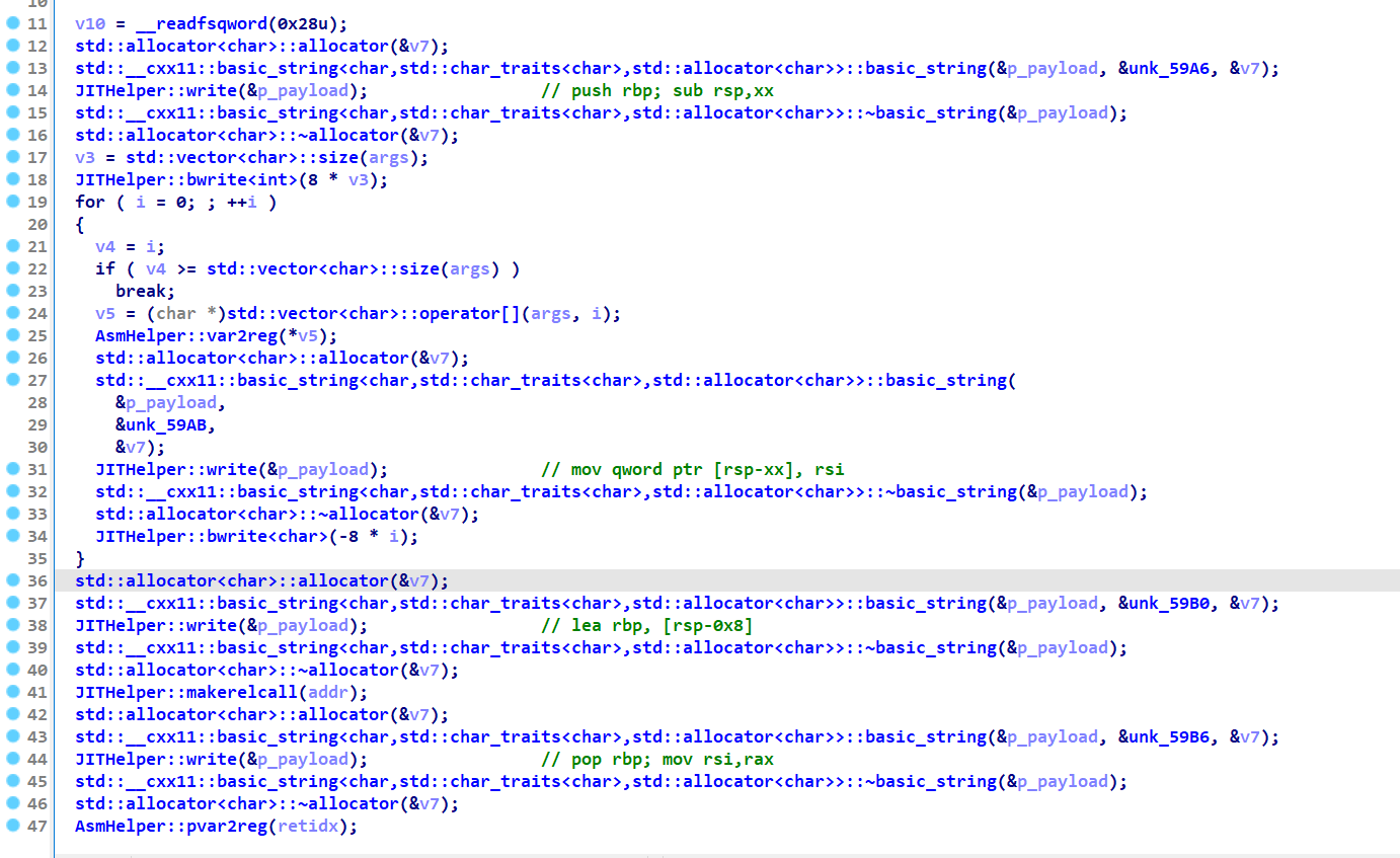 首先可以看到一个比较特殊的点是push rbp, 这说明在这个jit中是父函数为子函数新建栈帧, 调整rsp, 分配栈空间