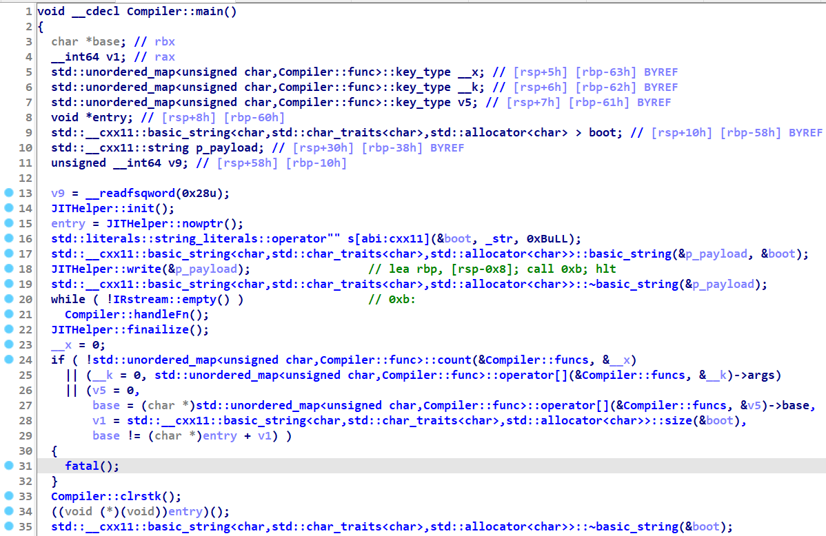 利用手法是经典的jit利用, 与ciscn 2022的llvm pass pwn相似, 主要利用汇编中的常数来作为汇编代码执行, 并通过jmp来连接