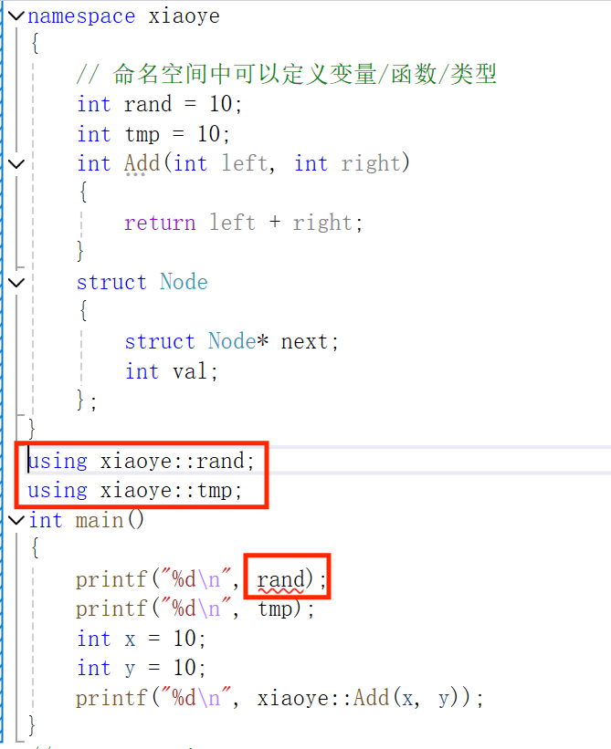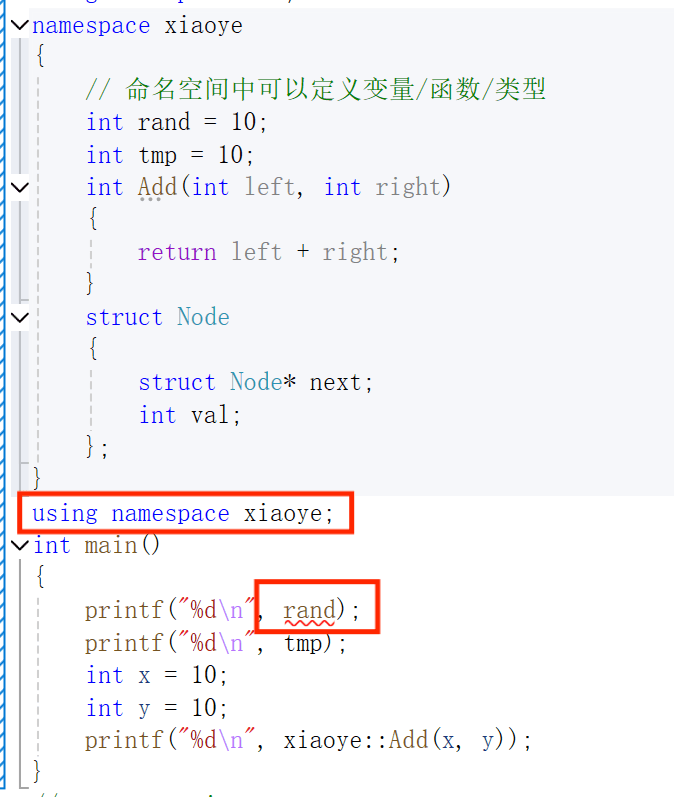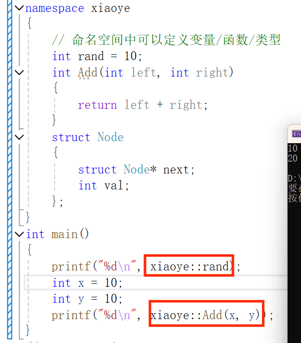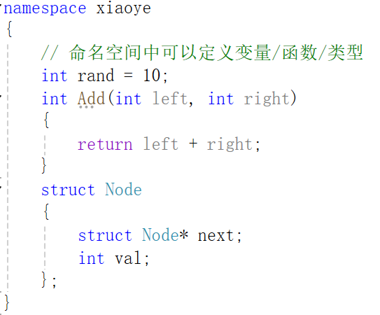 命名空间的定义方式是namespace关键字,后⾯跟命名空间的名字,然后接⼀对{}即可,{}中 即为命名空间的成员。命名空间中可以定义变量/函数/类型等。例如这里一个名为xiaoye的命名空间,这里的rand为变量,Add为函数,Node为类型。