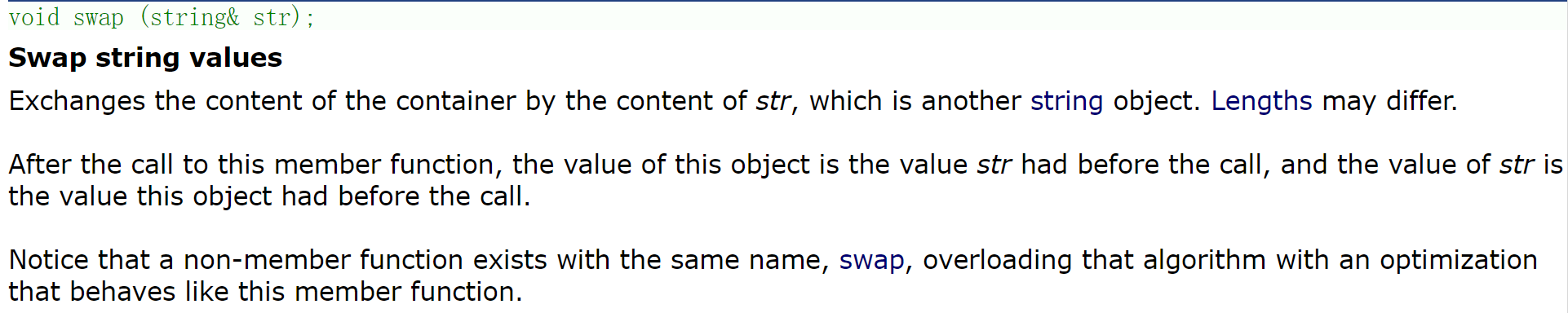交换函数,将当前字符串容器的内容与另一个字符串对象str的内容进行交换。两个字符串的长度可能不同。调用此成员函数后,当前对象的值会变为str调用前的值,而str的值会变为当前对象调用前的值。库里面的std::swap针对于字符串也会调用这里的,因为库里面的swap如果不调用这里的swap会进行深拷贝,交换存在多次的拷贝构造,对于内置类型效率还好,对于自定义类型效率会很低,谨慎使用。