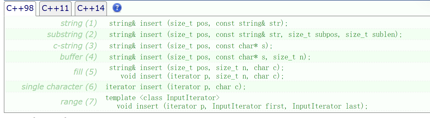这个函数和前面的append最大的差别就是它是指定位置插入,而不是直接尾插。所以它也有很多的重载,总体的分类方式和前面说的append类似,只是多了用迭代器指定位置的重载。