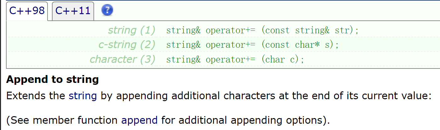 operator+= | 字符串拼接(公有成员函数 ) 用 += 语法直接拼接字符串,如 s += "abc"; |