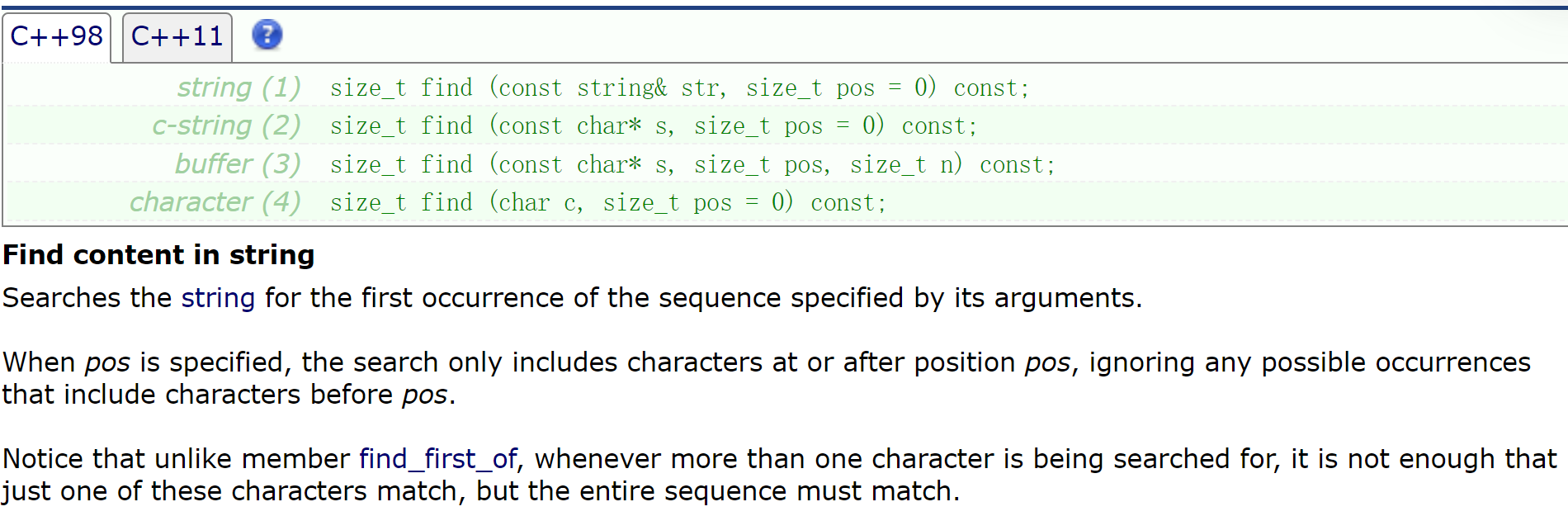 find | 在字符串中查找内容(公有成员函数 ) 查找子串 / 字符首次出现的位置 |