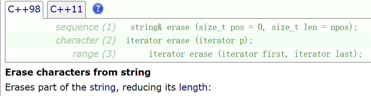 这个函数是用来在指定位置删除字符串,这里的len用来指定删除的长度,npos前面介绍过是-1,还有就是迭代器的版本,其实也就是指定删除的区间。
