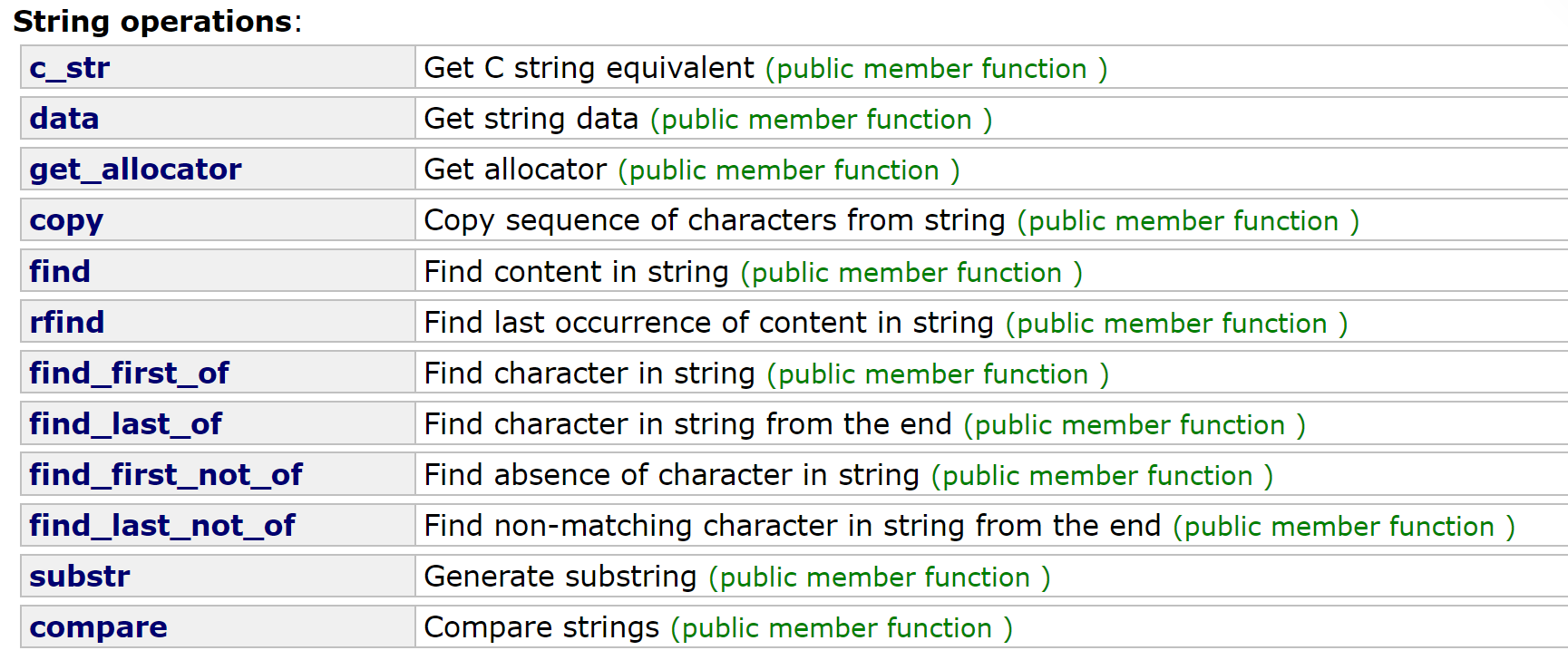 compare | 比较字符串(公有成员函数 ) 按字典序比较两个字符串,返回差异结果(类似 strcmp ) |