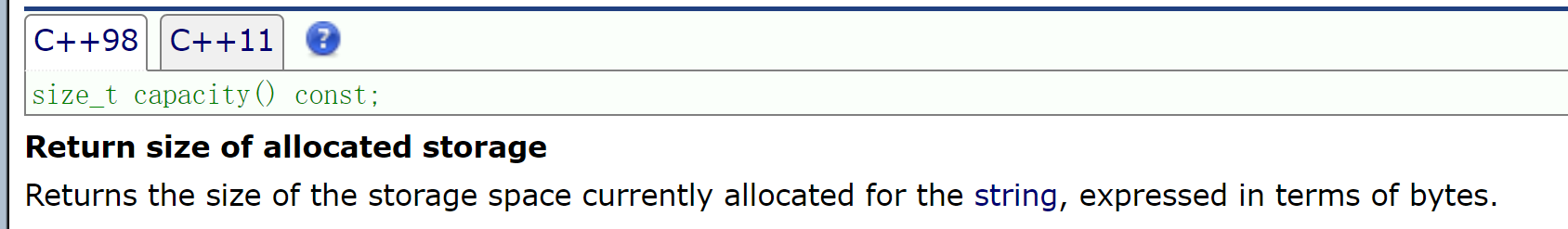 capacity | 返回已分配存储容量的大小(即当前为字符串预留的内存能容纳的字符数 ) |