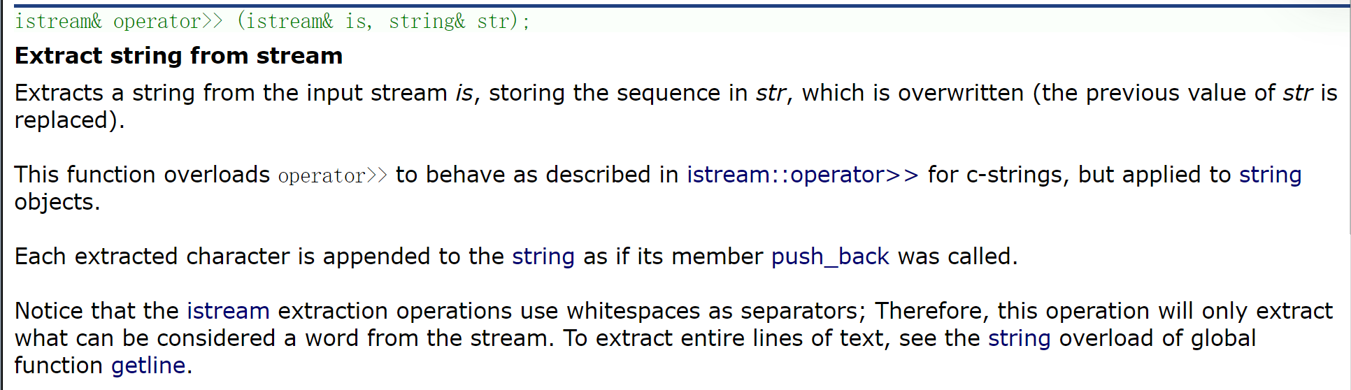 这里是对流输入操作符进行重载,它的重载是因为对于类来说,直接使用流输入操作符输入是会报错的,需要让它完成我们需要的输入方式就需要我们直接去写重载函数。它的功能基本上都是对于字符串就相当于一个个尾插到指定的string类对象中,不过要注意输入流的提取操作会将空白字符(如空格、换行等 )用作分隔符,不过下面的getline就可以解决这个问题。