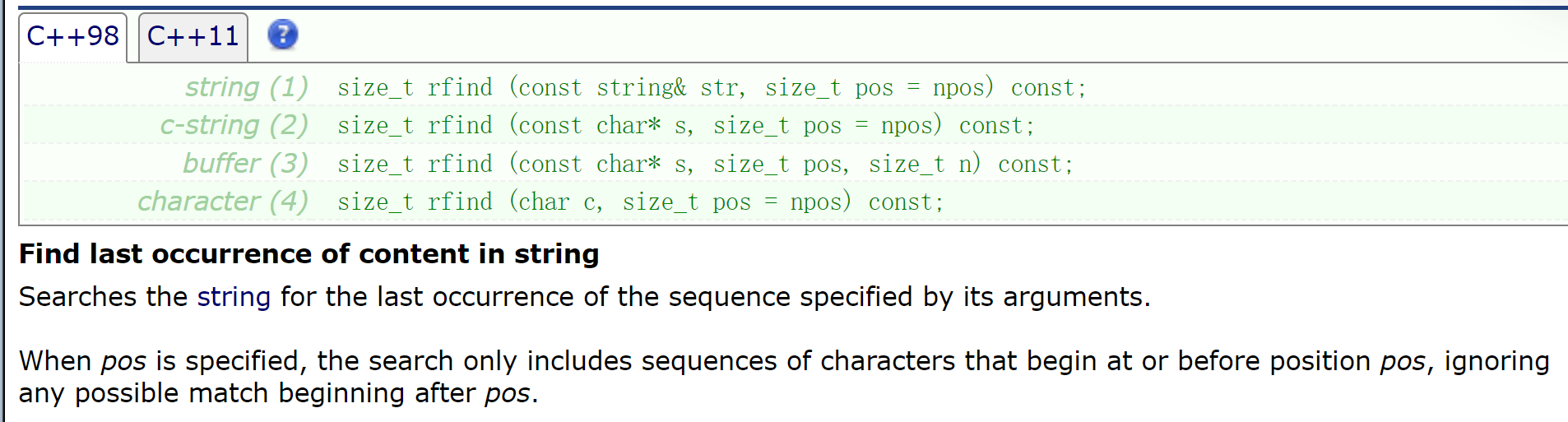 rfind | 在字符串中查找内容的最后一次出现(公有成员函数 ) 从后往前找子串 / 字符 |