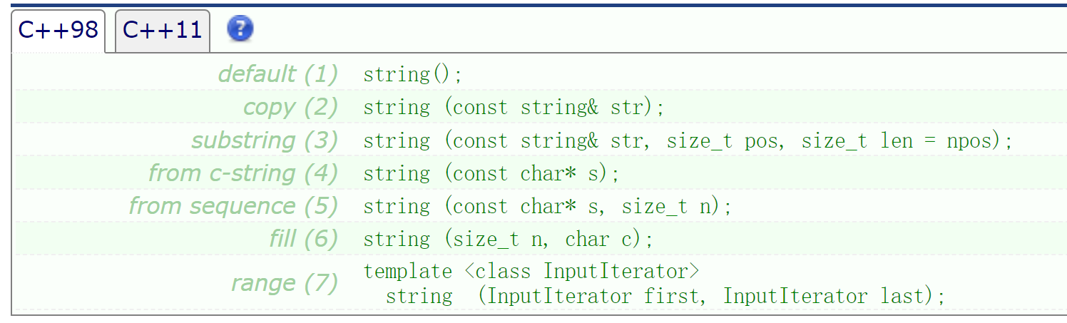 首先参考一下比较权威一点的网站的string构造函数声明。一共七种,作为新手最后一种先不做了解,因为涉及到了迭代器,就先了解一下前六种。