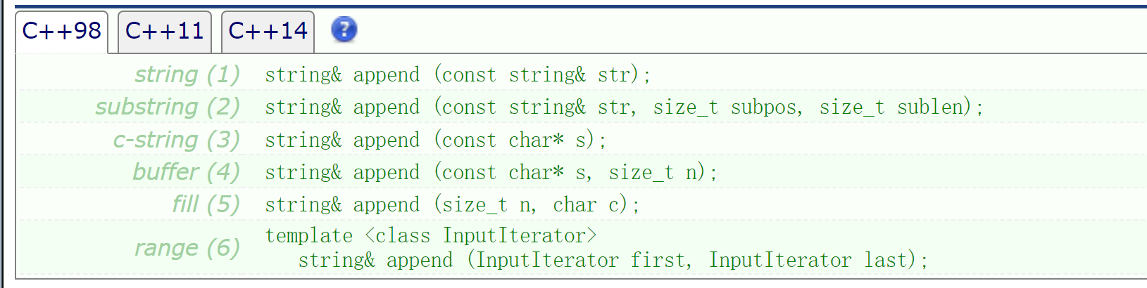 append函数是在原来的字符串后面插入一个字符串。这里重载了很多种,其实就是先分为传参的类型是传的string类的引用,字符串,还是n个字符或者是迭代器区间。然后分为是指定插入的字符串插入区间,或者是插入的字符个数。