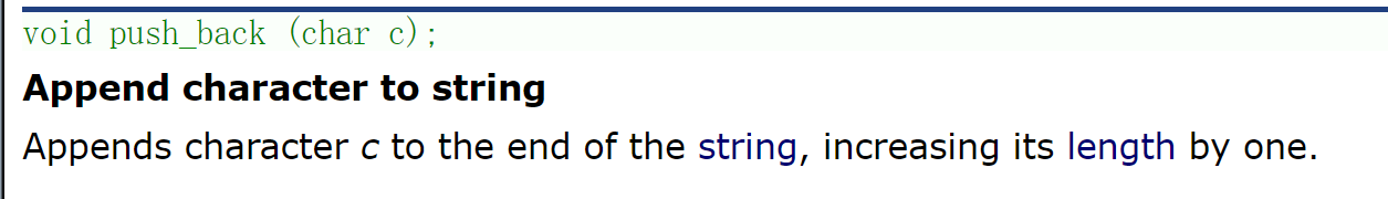 push_back | 字符追加(公有成员函数 ) 向字符串末尾追加单个字符,如 s.push_back('!'); |