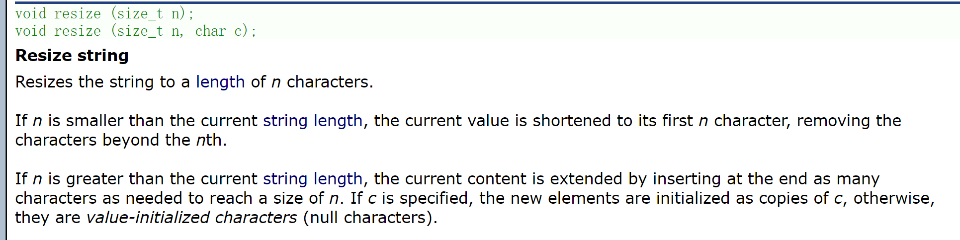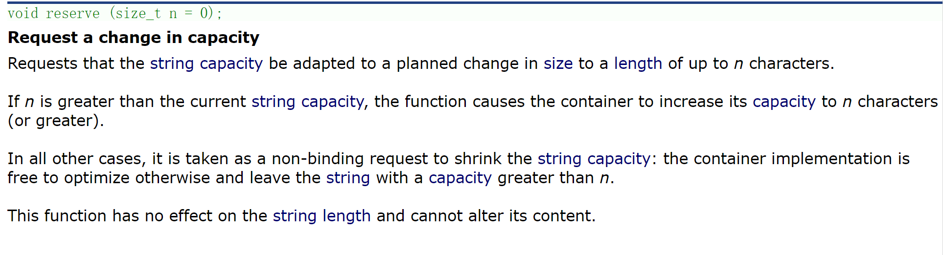 关于reserve函数内容描述有点多,简单来说就是变更容量,这里分两种情况,第一种当n(请求更改的大小)大于当前的容量,就会增长容量到n,另一种情况当n小于当前的容量,这个时候具体缩容不就是不确定的,不同编译器有不同的选择。不过必须保证不会影响字符串的长度,不能更改其内容。在vs中是不会进行缩容的操作,也就是n小于容量不处理。
