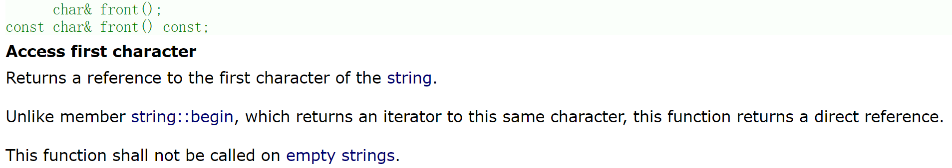 front函数和back函数对应,返回首字符,也不能够为空字符串。它和string::begin有区别,它返回的是字符的引用,而string::begin是返回迭代器iterator。