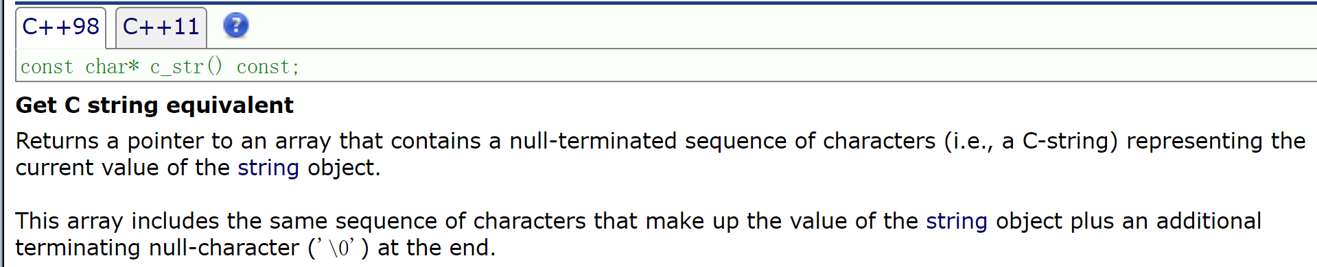 这个函数返回一个指向字符数组的指针,该数组包含一个以空字符(\0)结尾的字符序列(即 C 风格字符串),表示当前字符串对象的值。此数组包含构成字符串对象值的相同字符序列,且在末尾额外添加了一个终止空字符('\0' )。这里的data函数也和这个函数类似,在C++11之前有一点差别,不过之后功能几乎等价就不做过多介绍了。