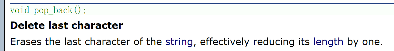pop_back | 删除末尾字符(公有成员函数,C++11 及以上 ) 移除字符串最后一个字符,如 s.pop_back(); |